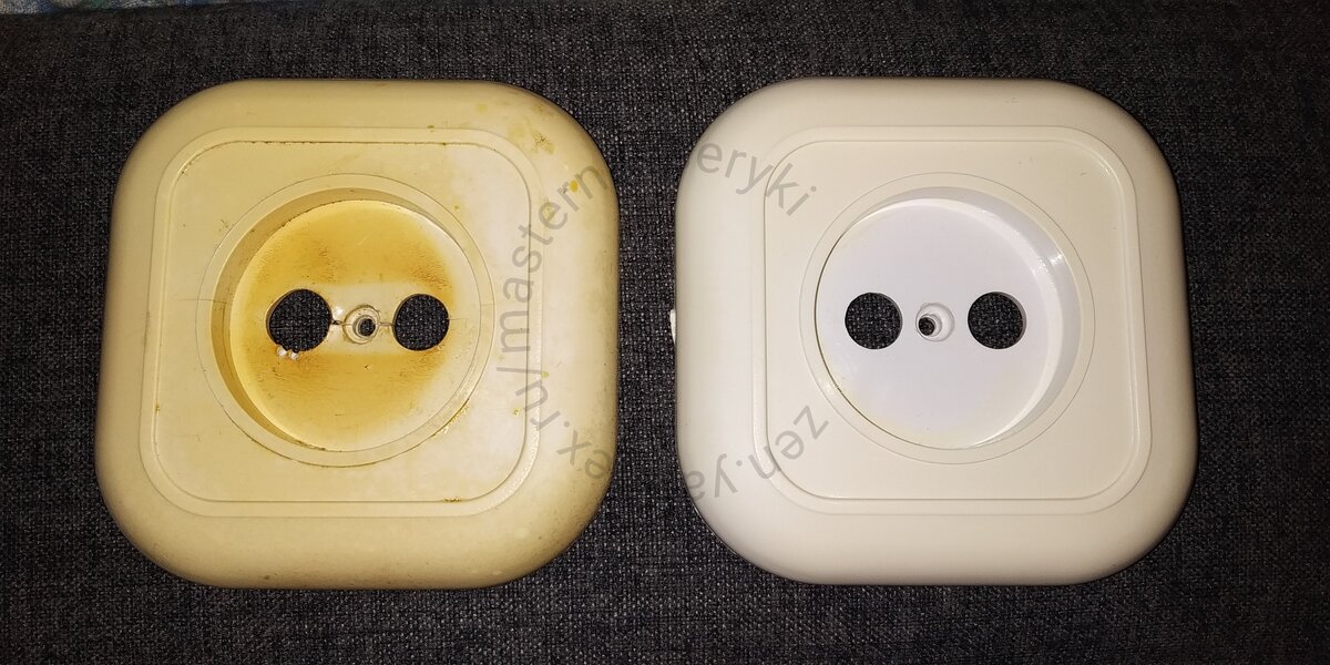 Изделия из пластика прочно вошли в нашу жизнь. В каждой квартире найдется не мало различных предметов из этого материала. Например, корпус холодильника, микроволновки и прочие бытовые мелочи обычно выполнены из белого пластика. И все бы хорошо, но со временем они начинают желтеть. Причин, приводящих к этому, достаточно много, начиная от неправильного ухода и заканчивая некачественными компонентами в составе. В результате изделия из пластика теряют привлекательный внешний вид, хотя свои основные функции выполняют исправно. Проблема эта очень распространенная, но вполне решаемая в домашних условиях. Как? Рассмотрим ниже. Чтобы наглядно продемонстрировать эффективность средства, которое будем использовать для отбеливания пластик, возьмем лицевую панель розетки. Она изрядно пожелтела за годы эксплуатации на кухне. Первым делом откручиваем лицевую панель розетки и отмываем ее от налипшего жира, пыли и грязи с помощью средства для мытья посуды, используя старую зубную щетку. Для того,