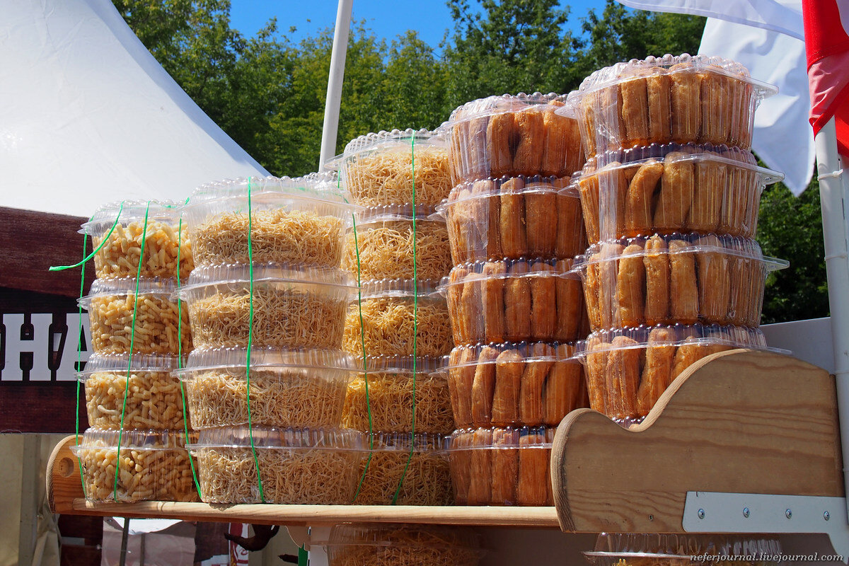 Чак-чак. Много чак-чака! А еще баурсаки. Это что-то вроде пончиков. Могут заменить хлеб, сладкие подают как десерт. Мелкая вермишель - вроде домашняя лапша.