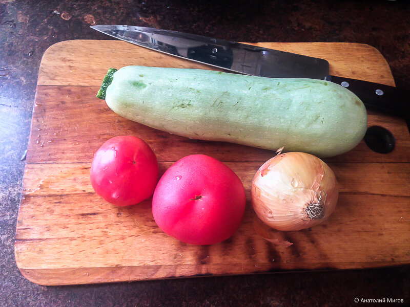 На завтрак я люблю яйца и овощи. Основа - кабачки и помидоры, они сейчас у нас на грядках зреют. А лук с рынка, мы лук не выращиваем.