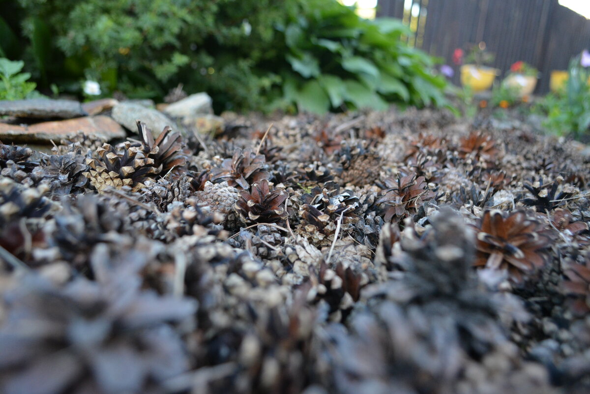 Да, красиво, эстетично, но может серьезно навредить почве и растениям. Спросите почему? Оказывается шишки - злостный закислитель для почвы. Кислая почва - раздолье для сорняка: осота, полевого хвоща, подорожника, кислицы, а самое главное - это тормоз для развития многих растений. И не сразу становится понятно, почему благоденствовавшие до этого культуры вдруг затухают и прекращают расти. А во всем виноваты шишки! При регулярном поливе шишки начинают разлагаться уже в первый сезон и делают свое "черное" дело. Поэтому, принимая решение замульчировать ими клумбу, внимательно выбирайте растения. Ведь есть и любители кислой почвы - это все хвойники, можжевельник, рододендроны, люпины, настурция, портулак, подсолнух, пион, гвоздика и многие другие. Для них такое мульчирование - подарок. Но если очень хочется, то можно даже для растений, любящих нейтральную почву, сделать мульчу из шишки. Для этого нужно внести на верхний слой грунта доломитовую муку (500-600 гр. на 1 кв.м) или золу (800-10