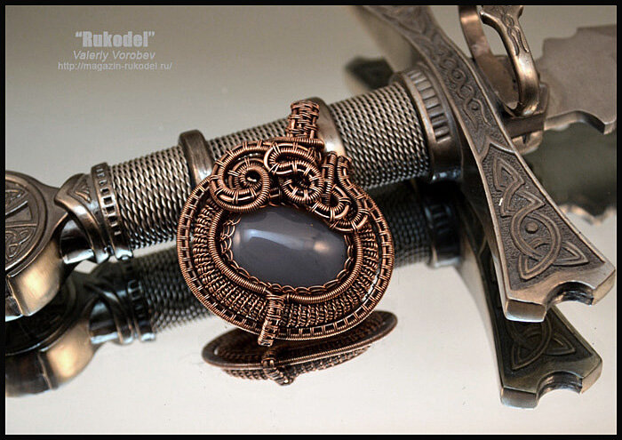 Кулон из медной проволоки и кабошона из натурального, природного камня. Основным элементом этого кулона является спираль, сделанная все из той же медной проволоки. Хочу предупредить - это не подробный мастер класс. Я хочу вам показать процесс сборки кулона из проволоки. Не боги горшки обжигают... Смотрите Видео сборки спирали с помощью двух старых ручных дрелей. Важная часть процесса - это крепление кабошона. Есть специальный способ крепления камня. Встраиваем спираль. Украшаем оплетками. Заметьте, мы используем обычную медную проволоку толщиной 1 мм и 0,4 мм. При желании, медную можно заменить на любую другую проволоку. Хоть на серебряную. Вот и все. Осталось запатинировать (состарить) проволоку и отполировать. Если вы хотите научится делать украшения из проволоки своими руками рекомендую заглянуть ко мне на сайт. Не пугайтесь, посмотрите видео урок для начинающих и вам все станет понятно. Валерий Воробьев. Мастерская "Рукодел" Другие статьи автора: Кулон из аммонита и проволоки н