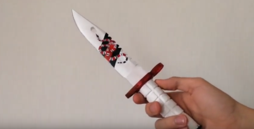 Всем привет! Мы с вами сегодня соберем штык-нож М9, весьма в необычном его окрасе. Для изготовления штык-ножа нам понадобится простой набор инструментов и материалов, а именно: Итак начнем с основной части ножа. Вырезаем ее из чертежа и и приклеиваем с помощью клея пва на на 6 мм фанеру. Перед тем как мы ее начнем вырезать как показано на картинке, через которое позже лобзиком вырезаем овальное отверстие ножа. Далее можно вырезать саму основу. Следующим шагом также вырезаем гардию из чертежа и приклеиваем с помощью клея пва к фанере. Перед тем как ее вырезать мы берем дрель и делаем отверстия как показано на картинке. Это сделано для того чтобы потом, вырезать отверстия с помощью лобзика. Дальше выравниваем гардию изнутри с помощью надфиля. Вернемся к основной части ножа берем наждачную бумагу и исправляем ей все неровности. Теперь можно приступать к заточке лезвия. Делать ее можно с помощью рашпиля или напильника. Не забываем заточить зубчики ножа. Следующим шагом сд