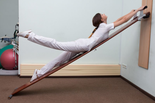 Я решила сделать подробный материал про доску Евминова, так как не все знают, как полезен такой домашний тренажер. Сегодня я опишу основные особенности этой конструкции и главные преимущества. Что собой представляет доска Евминова Приспособление, которое запатентовано специалистом Евминовым, имеет форму доски, изготовленной обычно из сосны. Благодаря материалу обеспечивается гибкость конструкции, что идеально подходит для упражнений на растяжку спины. При этом конструктивно предусмотрена возможность подстраивать размеры приспособления под рост пациента. На доске Евминова крепится ручки в количестве 8 шт. У них различное назначение, поскольку применяются в разных комплексах упражнений. В некоторых случаях можно крепить дополнительные аксессуары – метр роста, петлю для занятий, коврик. Поскольку механизм растяжки может требовать сильного воздействия на мышцы и позвоночник или более плавные, то профилактор оснащен устройством регулировки угла доски. Тренажер устанавливают возле обычной