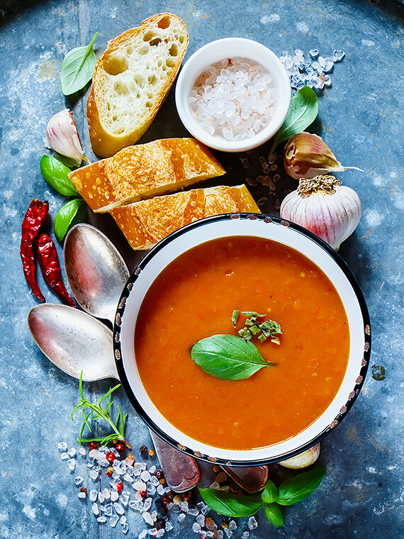 А ведь на самом деле совершенно не обязательно так усложнять себе жизнь. Просто выберите гаспачо, испанский томатный суп — классику, с которой справится даже новичок. Основные составляющие этого супа: свежие помидоры, паприка, огурец и томатный сок. Все остальное — подбирайте на свой вкус и в своих пропорциях.