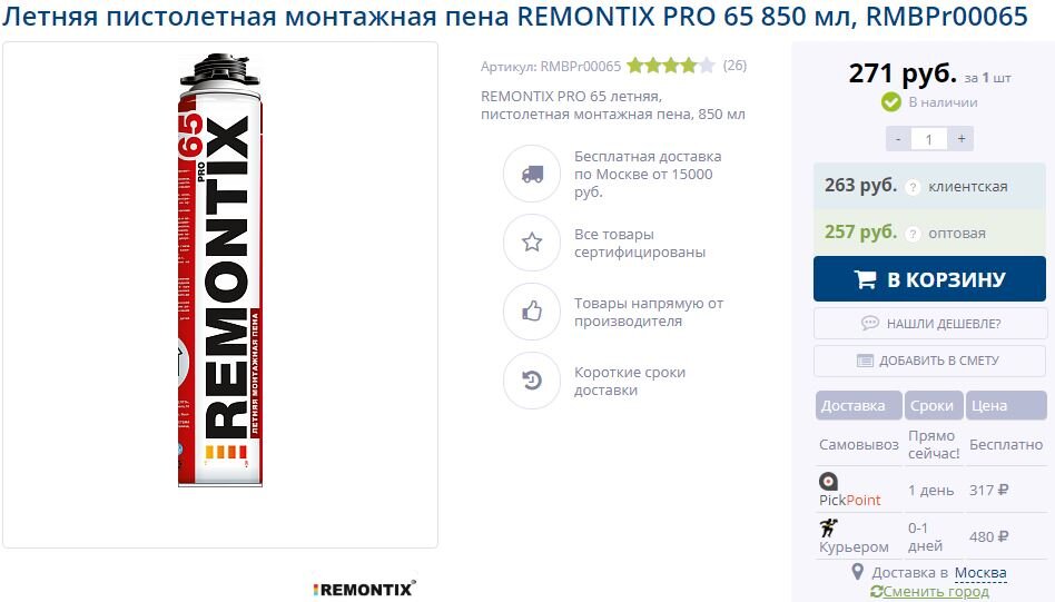 Результаты выпенивания: фактический выход одного баллона пены REMONTIX PRO 65 (лето): 11* 1,15 = 12,65 метров. Пена REMONTIX (Ремонтикс) PRO 65 (лето) имеет плотную структуру без полостей, и ракушек. Где применяют REMONTIX PRO 65 (лето)? Цена на пену REMONTIX PRO 65 (лето) в каталоге СТМаркт: 271 рубль за баллон без учета персональной накопительной скидки и скидки при оплате онлайн. Доставка заказов по всей России.