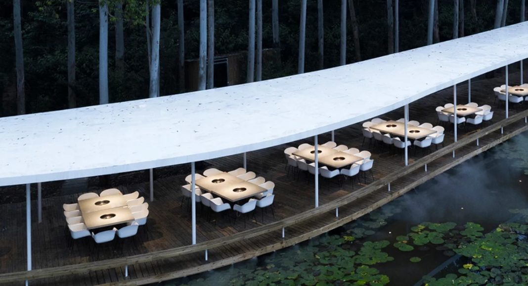 MUDA-architects завершила проект ресторана «Garden hotpot» в юго-западной части Китая, который простирается через эвкалиптовый лес. Название «Garden hotpot» в переводе означает «садовое рагу». Именно тушеное мясо с овощами является главным блюдом этого заведения. Благоприятный климат региона позволил построить «Garden hotpot» на открытом воздухе, чтобы посетители смогли окунуться в природный ландшафт. Конструкция Тонкие трехметровые колонны, диаметром 88 мм, поддерживают навес крыши, который извивается рядом с лотосовым прудом. Фундамент «Garden hotpot», на котором расположены столики разных размеров, изготовлен из антикоррозийного дерева. Навес сделан из оцинкованной стали. Чтобы сохранить природную среду и минимизировать вмешательство человека, MUDA-architects провела обширное картирование места. «Garden hotpot» был спроектирован с учетом расположения эвкалиптовых деревьев и самого озера. MUDA-architects видела в проекте возможность экспериментировать с маломасштабной и недорогой арх