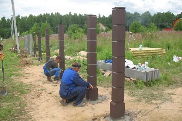 Первый этап является наиболее ответственным, так как столбы будут главным несущим элементом ограды. Если они деревянные, то ту часть, которая будет в земле, надо обжечь, просмолить и обернуть рубероидом. Если же столбы металлические или асбестоцементные, то их заливают бетоном или затыкают пробкой, чтобы внутрь не попадала вода.