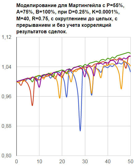 Обратите внимание на такой интересный момент на этом рисунке. "Желтый" трейдер вынужден был прервать использование Мартингейла после 770-й сделки. Но при этом он остался в плюсе. У него на момент прерывания капитал больше стартового капитала в 1.094 раза.