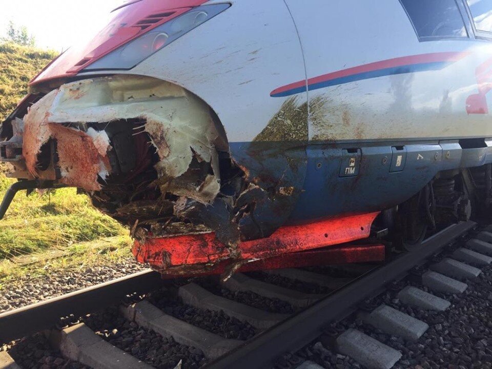 Это - голова "Сапсана", сбившего корову на путях в районе Окуловки (рейс 8 июля). Причем поезд продолжил движение и в Тверь прибыл всего на 9 минут позже расписания. А в Москву - и вообще по графику! UPD. Более точное место происшествия - пешеходный переход на ст. Мстинский Мост. Там корова и проникла на пути. Судя по служебному документу РЖД (см. ниже), через переход не спеша шествовали 4 коровы. Три - прошли, а вот четвертая уже не успела. "Сапсан" рейса №771 налетел на неё обтекателем и уже через 8 минут продолжил движение. Обтекатель пустотелый, внутри ничего нет, он служит не только для аэродинамики, но и для амортизации препятствий. Ну а корове, конечно же, кранты. Непонятно ещё, кто будет отвечать за повреждение "Сапсана" и не привлекут ли к этому хозяйку коровы :)