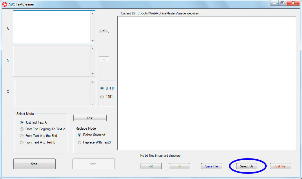 Возникла необходимость быстрого поиска и замены фрагментов текста во множестве текстовых файлов. Вообще-то такие программы уже есть, например Text Replacer (ищем в гугле) но такой, чтобы поиск происходил вот так быстро и визуально, мне что-то не попалось. Поэтому быстрее было написать такую программу самому. Программа состоит из одного единственного файла и не требует установки. Качаем её тут: https://yadi.sk/d/W2ys6PjS-kBzRw, распаковываем. Запускаем. Интерфейс выглядит так: Жмём на кнопку Select Dir. Выбираем каталог с текстами, которые собираемся редактировать. По умолчанию будет выбрана папка, в которой находится программа. Так что можно сразу же её закинуть в каталог с текстами. Всё для удобства. После выбора каталога, в окно встроенного редактора загрузится текст первого попавшегося файла. Кнопками со стрелками "<<" и ">>" путешествуем по файлам, загружая в редактор следующий файл или возвращаемся обратно. Допустим нужно во всех файлах вырезать всё что идет после выбранного фра