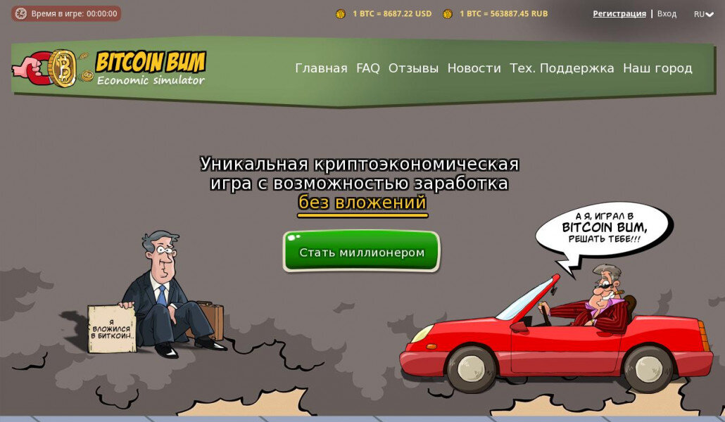 Bitcoin Bum - это криптоэкономическая стратегия, которая позволит пройти путь от бомжа до миллионера и заработать реальные деньги. Искрометный юмор, яркий сюжет, широкие возможности для заработка не оставят тебя равнодушным. Трехуровневая партнерская программа bitcoin-bum позволяет обеспечить пассивный доход даже с одного реферала приведенного в игру. На мониторинге FreeMonitor.pro