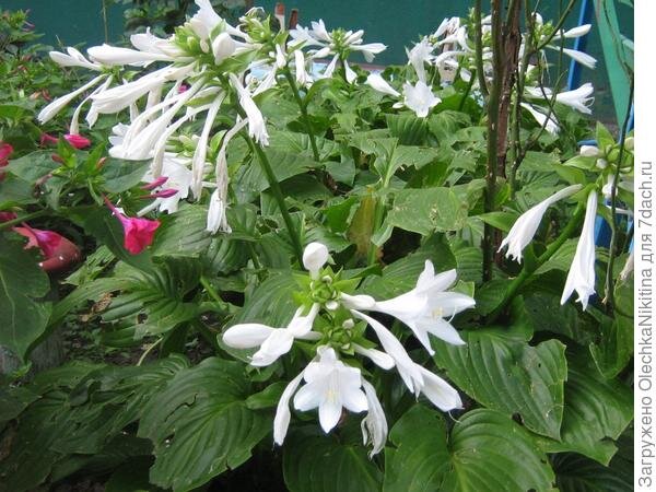 Хосты можно найти. наверно, в любом саду. При этом, несмотря на общеизвестное правило о том, что это растение лучше всего себя чувствует и выглядит в тени, хосты довольно часто высаживают и на солнце. Эти растения, особенно их низкорослые формы, отлично подходят для обрамления цветника, выделения тропинок в саду, декорирования стен дома. У меня. например, хосты растут с двух сторон крыльца в сочетании с разноцветной декоративной травой и выглядят просто прекрасно. Главное украшение хосты - яркие декоративные листья, которые бывают самого разного цвета. И именно в тени хосты выглядят ярко и нарядно - на солнце форма листьев, конечно, сохраняется, а вот краски значительно бледнеют. Голубые хосты становятся почти зелеными, желтые теряют интенсивность окраски, а белые пятна и прожилки на листьях становятся сероватыми. Зато на солнце хосты ярче и продолжительней цветут, что тоже немаловажно. Цветки у этих растений довольно невзрачные, но они стойкие, высокие и очень похожи на колокольчик
