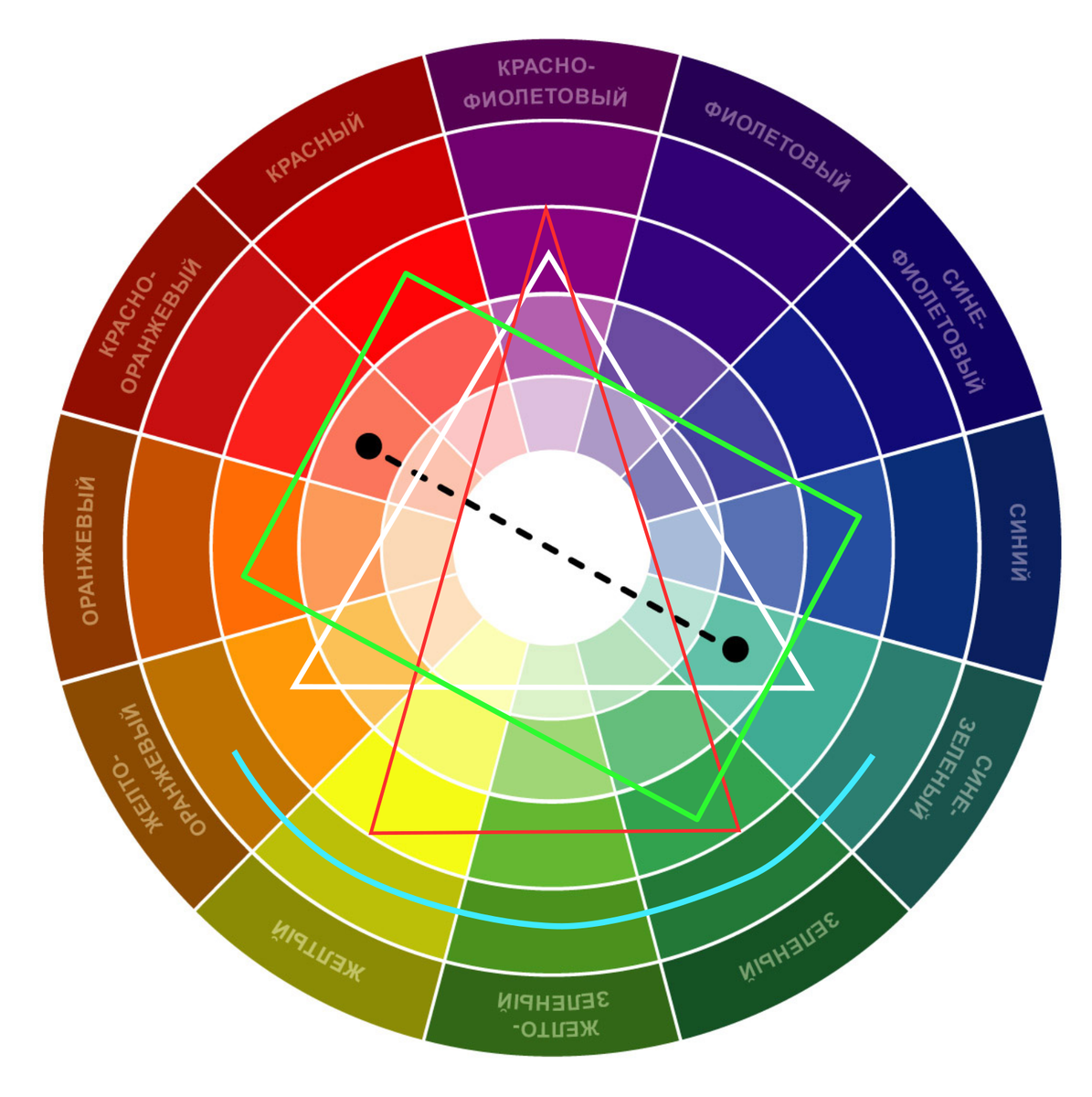 Привет, мои дзенанутые! Поговорим о сочетании цветов в одном изделии? Ведь помимо подбора по составу пряжи и узора важное значение и у цвета пряжи. Неправильно подобранный может даже красивый узор оставить неприметным. Например, пестрый меланж скровает красоту ажура. Теплые тона Красный, коричневый, желтый и оранжевый цвета придают яркость и подчеркивают глубину. Их сочетание облагораживает и придает богатый вид изделию. Холодные тона Синий, фиолетовый и зеленый балансируют цвета теплых тонов и наполняют уютом. О цвете знают лучше всех художники, почему бы не воспользоваться их способами? Возьму палитру и попробую подобрать цвета по четырем методикам. Важно брать цвета с одного уровня. Комплиментарный способ Для сочетания двух цветов провести прямую линию через центр круга и взять цвет, равноудаленный от центра (черная линия). Светлые тона холодного сине-зеленого и теплого красно-оранжевого будут смотреть очень гармонично. Триада Для сочетания трех цветов, строят равнобедренный треуго
