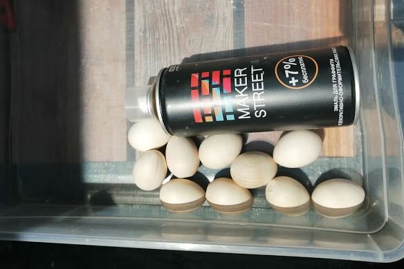 - 🐤 Потом чёрной краской создаём точки (фото забыла сделать). Для этого нужно слабо нажимать на распрыскиватель, не до конца и короткими нажатиями. Потренируйтесь на поверхности лотка. Тогда баллон плюётся маленькими каплями, которые и нужны. Оставляем сохнуть ➡️
