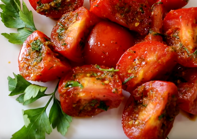 Друзья!Сейчас наступает сезон вкусных(настоящих)овощей и вы просто обязаны порадовать себя и своих близких данным блюдом.Поверьте мне, это очень вкусно!!! Ингредиенты Шаги Помидоры берём НЕ крупные, но спелые, режем их на 4 части, не мельчим.Перекладываем их в миску, в которой они и будут мариноваться. Блендером измельчаем перец болг., чеснок, зелень, чили.Зелень используем не всю.Немного оставляем. Добавляем все специи, соль, сахар, выливаем масло и уксус.Всё хорошо перемешиваем. Далее, нарезаем оставшуюся зелень.Помидоры заливаем смесью из блендера, очень хорошо и очень аккуратно перемешиваем, добавляем оставшуюся зелень и снова перемешиваем. Убираем в холодильник на сутки, за сутки, нужно перемешать 2-4 раза, в холодильнике ароматы приправ и зелени, просто бомбические. Достаём из холодильника,накладываем в тарелку, кушаем и обалдеваем от вкуса))). Друзья!Если Вам понравился данный рецепт, то подробности вы можете посмотреть тут https://www.youtube.com/watch?v=knmINghAhx