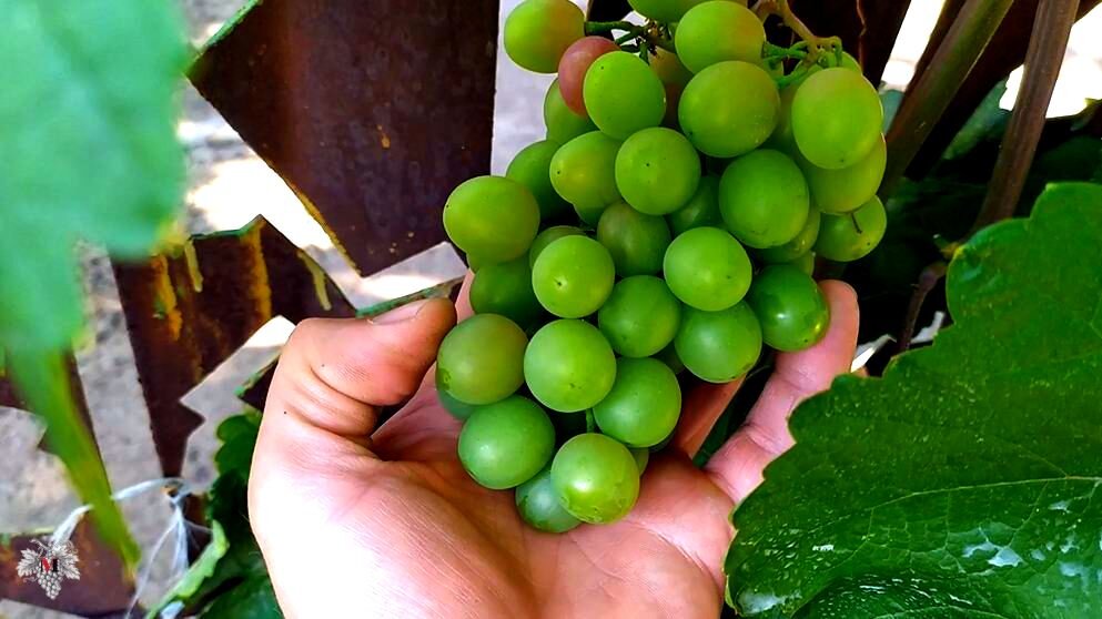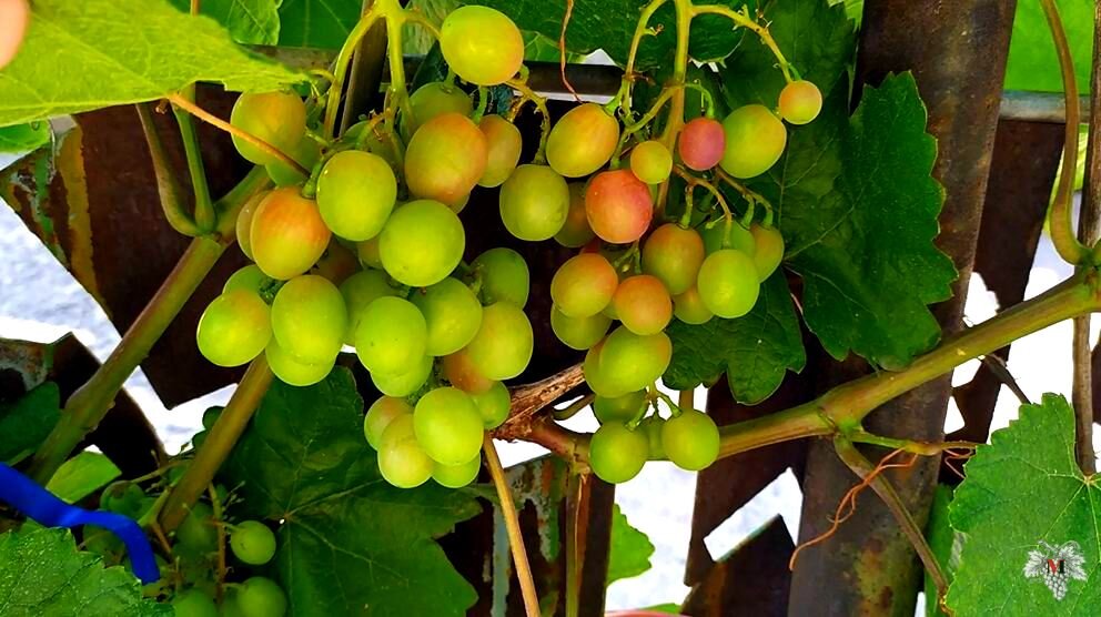 Я снова рад Вас приветствовать на своём канале. Последнее время, мне часто в комментариях, поступает один и тот же вопрос: Какой сорт или гибридная форма винограда у меня на винограднике начинает окрашиваться первым? На сегодняшний день, первым у меня начал окрашиваться виноград «Памяти учителя». На фото Вы можете наблюдать начальную стадию окрашивания данной гибридной формы. Так же начала постепенно размягчаться ягода винограда. Данный процесс окрашивания немного затянулся, так как куст винограда находится у меня во дворе и его сильно затеняют находящиеся вокруг деревья. На основном винограднике процесс окрашивания и размягчения ягод проходил бы гораздо быстрее, так как там все сделано по науке и нет никаких сторонних факторов влияющих на данный процесс. Грозди сформировались не большие, и они ориентировочно будут весить около полу килограмма. Куст относительно молодой, ему всего три года. А так же ещё раз повторюсь, этот куст находится не на основном винограднике, а во дворе дома, гд