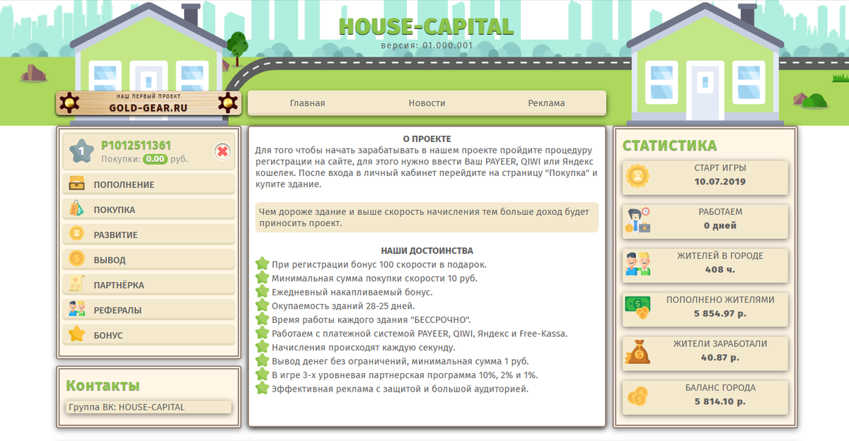 Для того чтобы начать зарабатывать в house-capital.top пройдите процедуру регистрации на сайте, для этого нужно ввести Ваш PAYEER, QIWI или Яндекс кошелек. После входа в личный кабинет перейдите на страницу "Покупка" и купите здание.
