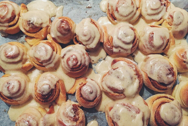 ИНГРЕДИЕНТЫ Молоко 200 мл Сухие дрожжи 11 г Пшеничная мука 850 г Яйцо куриное 2 штуки Сливочное масло 200 г Тростниковый сахар 200 г Ванильный сахар 10 г Сахар 100 г Сахарная пудра 100 г Корица 20 г Соль 1 чайная ложка Сливочный сыр 100 г ИНСТРУКЦИЯ ПРИГОТОВЛЕНИЯ 1. Дрожжи разводим в теплом молоке (плюс добавляем чуточку сахара (из начальных 100 граммов добавить). Пока дрожжи поднимаются, в отдельной миске взбиваем яйца. 2. К яйцам добавляем размягченное масло (1/3 от пачки). 3. В яично-масляную смесь добавляем сахар (оставшийся из начальных 100 граммов). 4. Смешиваем разведенные в молоке дрожжи со смесью из яйца, масла и сахара, тщательно перемешиваем в посуде, где в дальнейшем будем замешивать тесто. 5. Муку (600–700 граммов (сколько тесто возьмет, на самом деле) соединяем с солью. 6. Часть смеси (муки с солью) всыпаем в дрожжевое тесто и вымешиваем его. 7. Делаем клейковину (чайная ложка муки + чайная ложка воды -> смешать, слепить шарик и промыть холодной водой) и кладем по
