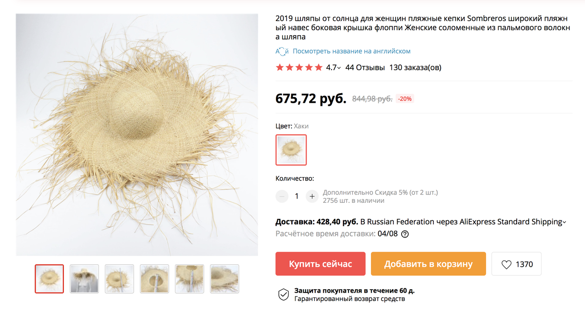 На лето я очень хотела себе новую соломенную шляпу. Однако, в той же Заре цены на них слегка завышены. Охапка соломы не должна стоить 3-5 тысяч рублей. А на Али шляпа с большими полями и необработанным краем, очень фотогеничная и обаятельная стоит почти в 10 раз дешевле. Я решила рискнуть...