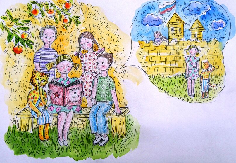 Девочка Соня сидела на лавочке около дома и увлеченно читала книгу Аркадия Гайдара «Тимур и его команда». Соседские мальчики, девочки и Братюня с ними стали звать Соню поиграть в догонялки. Соня говорит: «Нет, я читаю книгу». Братюня: «Идем играть в прятки». Соня: «Нет, такая интересная книжка!» Братюня: «Сонечка, прочитай нам вслух, пожалуйста!» Когда она закончила читать, ребята вздохнули: «Здорово, давайте создадим свою тимуровскую команду: у Братюни есть крепость на дереве – это будет штаб, а еще подзорная труба – в неё всю деревню и окрестности видно. Протянем для связи провода к дому каждого тимуровца-братюненца». Братюня: «А кому будем помогать? Может, мне? Иногда так котлетку хочется, а её нет…» Соня: «Мне бы хотелось помогать одинокой бабушке Шутихе, которая живет на краю. Мне её жалко: она почти ни с кем не дружит, и у нее даже кошки нет». Мальчик Коля: «Но она же злая: меня крапивой отстегала, когда я залез в её огород за мячиком». Братюня: «А в меня камнем кидала». Со