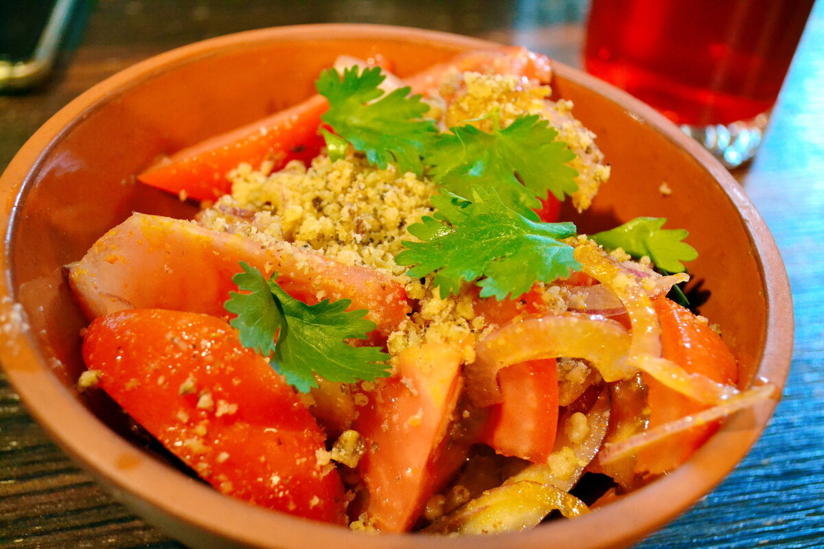 Привет, друзья! Мы сейчас с семьей уехали на пару дней подальше от городской суеты, и готовить возможности нет. Зато есть возможность вкусно есть в огромной куче местных кафешек и ресторанов. Жена весь день хотела овощей, и вечером мы нашли интересный вариант салата, который по описанию показался интересным. На вкус он оказался вообще отличным, несмотря на всю свою простоту. Спасибо за ваши лайки и репосты, этим вы очень помогаете журналу. Нам понадобится (на одну порцию): Помидоры - 1 большой Грецкие орехи - одно-два ядра Красный сладкий лук - треть средней Оливковое масло Кинза - по вкусу и по желанию Белый винный уксус - несколько капель Имеретинский шафран - щепотка Уцхо-сунели (голубой пажитник) - щепотка Соль - по вкусу Как готовить: Сначала подготовить соусную основу, смешав все, кроме помидоров. Орехи измельчить. Затем помидоры порезать дольками и все вместе смешать еще раз, посолить по вкусу. Большое спасибо шефу за отличное блюдо. И вы обязательно приготовьте! Список почти