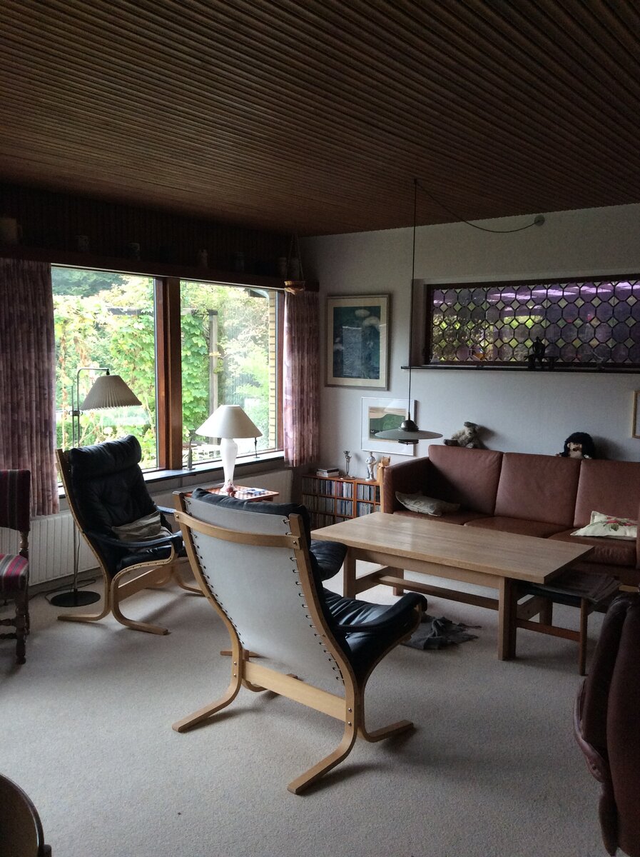 Во дворе дома нас улыбаясь встречает пожилой мужчина с седой бородой. Он похож на Санту. И так же смеётся. В кухне пахнет едой. Я знаю, что скоро увижу хюггелит интерьер. Так и есть: за стеной меня ждёт гостиная с мягкими креслами, большим столом для семейных встреч, коллекцией глиняных кружек и лесным видом из огромных окон.
