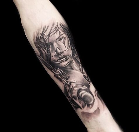 Одно из самых популярных татуировок с пистолетом — девушка со стволом. Как сказал великий Жан Люк Годар: ««Всё, что нужно для фильма — это пистолет и девушка».