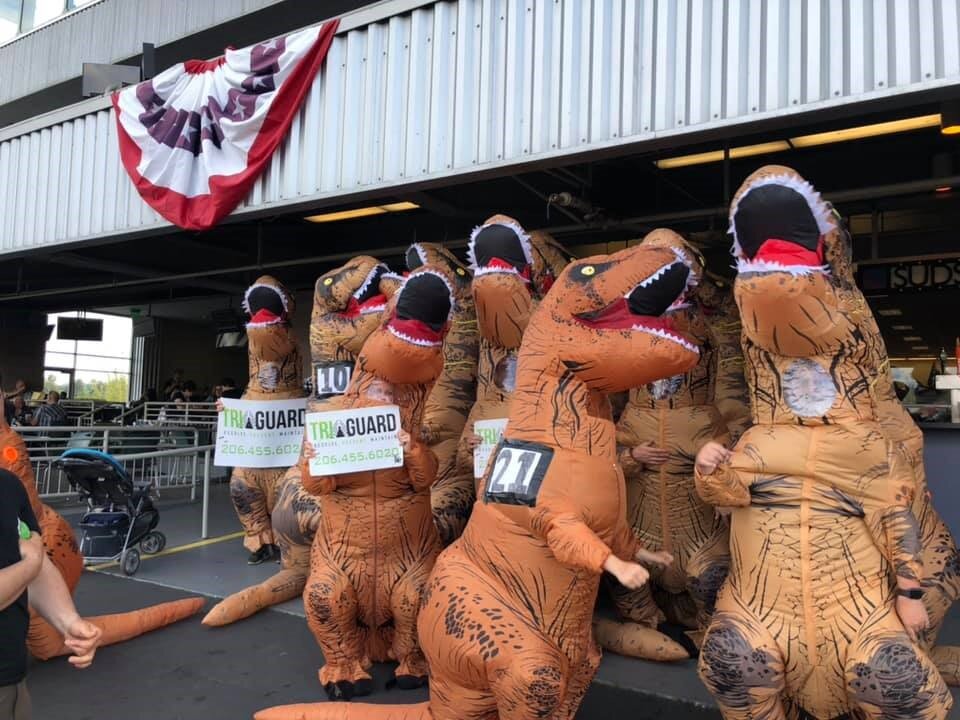 Американская компания для укрепления командного духа нарядила своих сотрудников в костюмы динозавров и отправила соревноваться друг с другом в беге. Забавное спортивное событие было организовано в городе Оберн (пригород Сиэтла, штат Вашингтон). Перерыв между вечерними скачками на ипподроме «Emerald Downs» скрасил невероятный спринтерский забег тираннозавров. В забеге участвовали 25 насекомоборцев, а победителем стал счастливчик под номером 13, от которого на долю секунды отстал номер 16, а третьим стала рептилия под номером 10. Фирма старается проводить подобные спортивные дни как можно чаще, ведь такие события не только поднимают настроение отдельных сотрудников, но и повышают корпоративный дух в целом. Из прошлых спринтов сотрудников можно также выделить «забег в гавайских нарядах» и «пробежку в римских тогах». Сами сотрудники относятся позитивно к идеям компании, да и реклама неплохая получается. В мгновение ока видео забега стало вирусным и разлетелось по социальным сетям всего ми