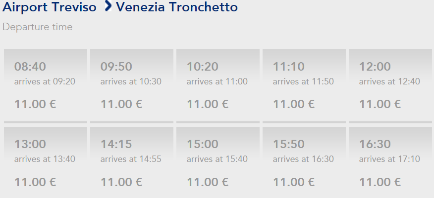 Как дешевле и удобнее всего добраться из аэропорта Тревизо в Венецию. Аэропорт Тревизо, находящийся в 40 км от Венеции обслуживает в основном бюджетные авиакомпании такие как Победа, Ryanair и Wizzair. Опытные туристы заранее задумываются, как же добраться из аэропорта Тревизо в Венецию. Рассмотрим варианты, из которых каждый сможет выбрать самый подходящий по своему вкусу и кошельку 1. На автобусе Самый простой способ добраться из аэропорта Тревизо в Венецию. На данном маршруте работают два автобусных перевозчика AVTO и TERRAVISION. Купить билеты можно прямо в холле аэропорта по прибытии, но если купить заранее онлайн — билеты могут стоить немного дешевле и не придётся искать кассу. Цены онлайн: AVTO — 12 евро в одну сторону, 22 евро — туда-обратно, TERRAVISION — 11 евро в одну сторону, 20 евро — туда-обратно. Время в пути около 40 минут, автобусы отправляются довольно часто. Обе автобусные компании делают остановку в Местре, где часто останавливаются путешественники, чтобы сэкономи