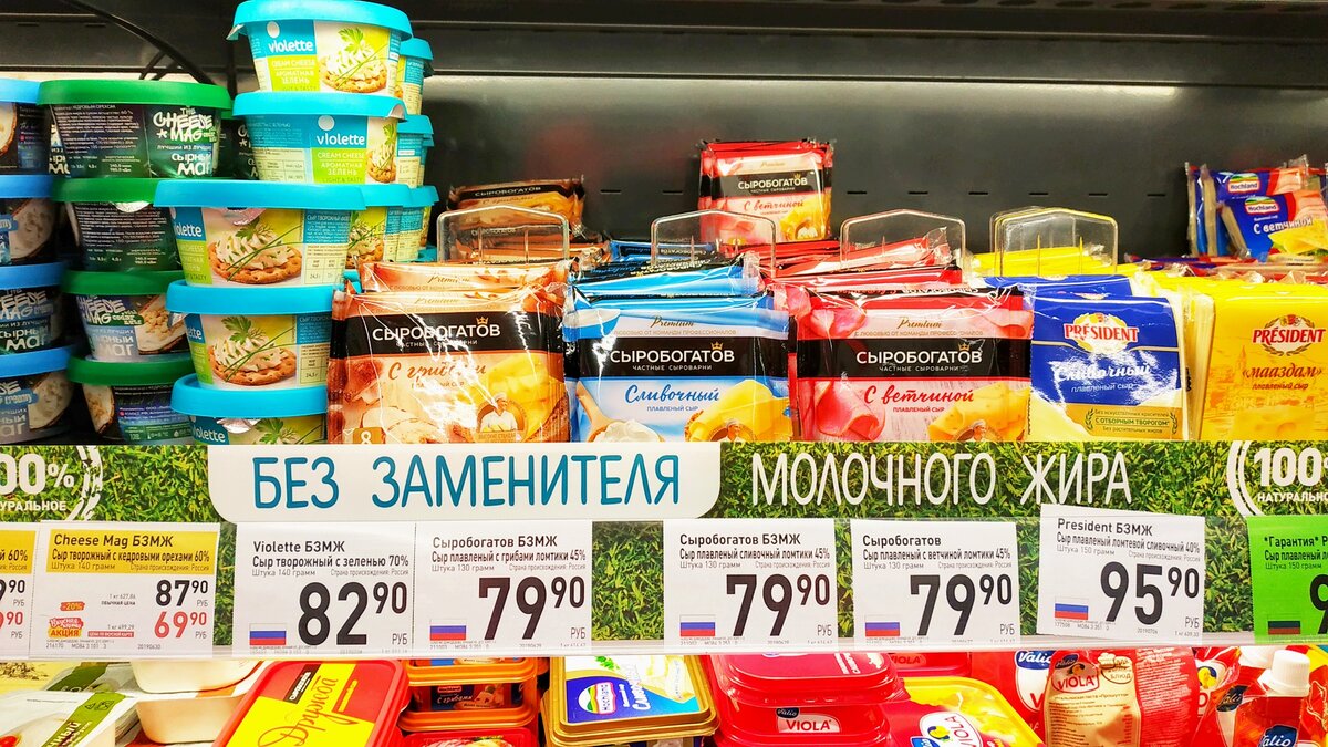 Недавно вступил в силу закон, по которому во всех магазинах обязательно нужно указывать наличие заменителей молочного жира в молочной продукции. Но некоторые магазины скрывают наличие заменителей в составе продуктов. В супермаркете BILLA, работающем в России, но принадлежащем немецкой компании, покупателям выдают неверную информацию в особо крупных масштабах. Тут прямо на полках написали «БЕЗ ЗАМЕНИТЕЛЯ МОЛОЧНОГО ЖИРА» и «100% натурально». На ценниках тоже БЗМЖ — без заменителя молочного жира. Но давайте посмотрим, так ли это на самом деле?! Вот сыр рассольный классический «Сиртаки» для греческого салата. На ценнике БЗМЖ, то есть без заменителя молочного жира. Смотрим внимательно мелкий шрифт на упаковке. Во-первых, это не сыр, а «рассольный продукт смешанного состава», во-вторых, в составе растительный жир, которого не должно быть в продукте без заменителей. Смотрим чуть ниже. На полке с продуктами без заменителя молочного жира лежит сыр Clever. На сыре Clever тоже надпись БЗМЖ, это