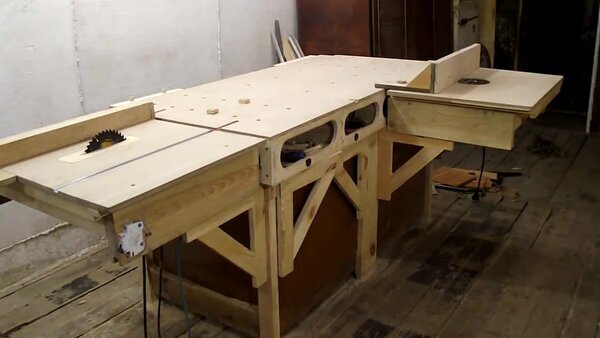 В этой публикации я решил собрать информацию о самодельных приспособлениях - самых востребованных у меня в мастерской. Универсальный верстак Основное рабочее место и самые ходовые станки объединены в один универсальный верстак. Это рабочее место имеет два съемных модуля - распиловочный и фрезерный, что дает возможность менять конфигурацию при необходимости. Основной стол служит верстаком и местом для хранения инструментов. Подробнее можно почитать и посмотреть здесь. Замена фуганку и рейсмусу. На этот же верстак монтируется другое приспособление, которое работает как фуганок и рейсмус. Подробнее об этом приспособлении смотрите здесь. Универсальный инструмент для сборки. Еще один, часто используемый инструмент - это самодельный присадочный фрезер. Это по сути особая площадка для фрезера, которая позволяет просто и точно делать отверстия под шканты. Подробнее об этом приспособлении смотрите здесь. Мой любимый станок Это самодельный лобзиковый станок. С его помощью можно делать вещи, ко