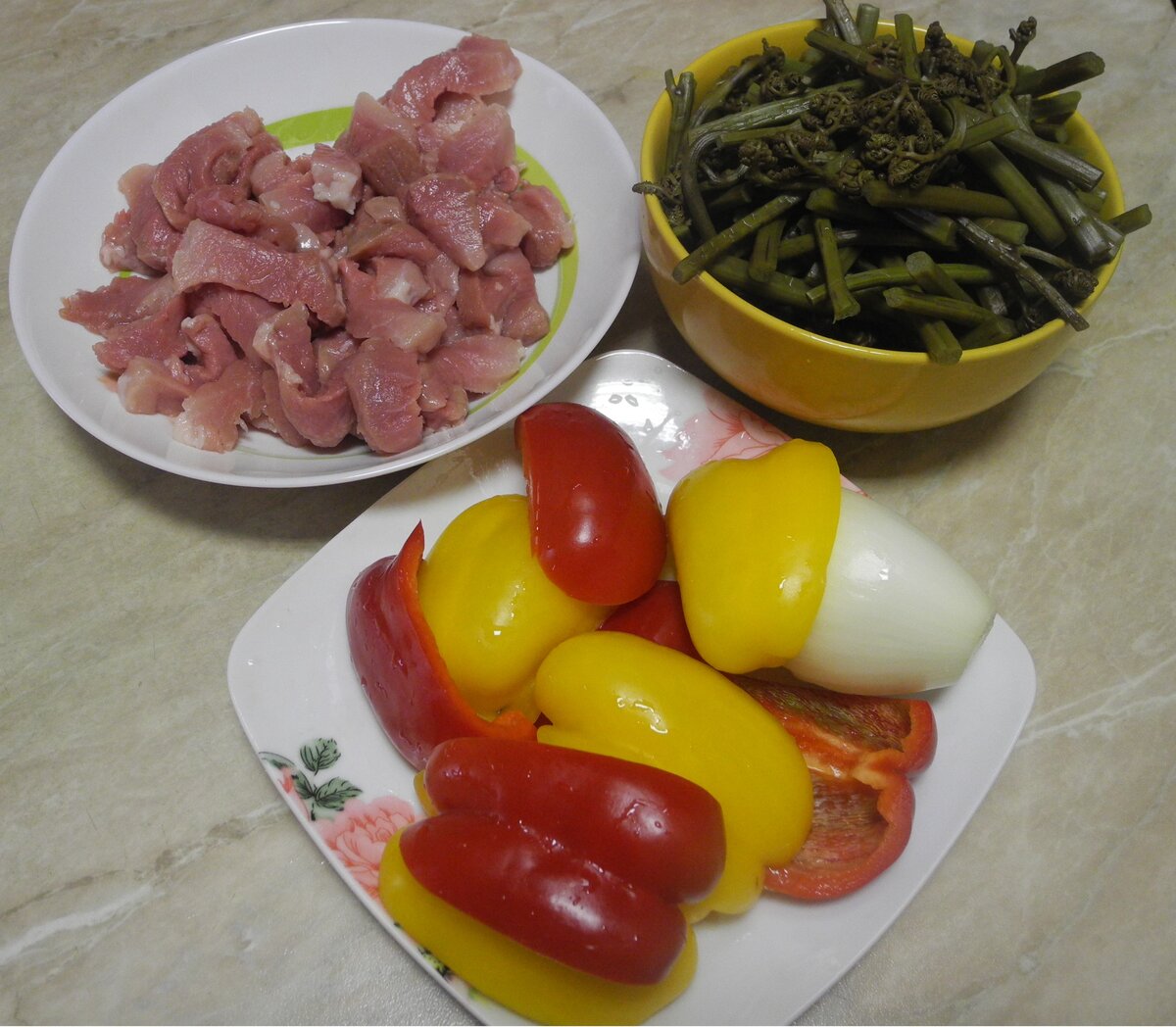 Предлагаю ещё один рецепт вкуснейшего блюда- папоротник со свининой и с перцем. В предыдущей статье я уже рассказывала как готовить папоротник. Здесь я предлагаю другой рецепт. Блюдо выглядит красиво, ярко, аппетитно. И вкус просто замечательный. Попробуйте приготовить. Для приготовления потребуется: 1. Свинина 300г 2. Папоротник 0,5 кг 3. Сладкий перец 2-3 шт (красный, жёлтый) 4. лук репчатый 1шт 5. томат 1 ст.л 6. чеснок 1-2 зубчика 7. соль, перец чёрный молотый 8. соус соевый 1-2 ст.л Подготовленный папоротник отвариваем 10-15 мин в кипящей воде. Так как папоротник будет потом обжариваться, важно его не переварить. В предыдущей статье о папоротнике рассказано, как его правильно подготовить. Мясо нарезать брусочками и обжарить. На другой сковороде обжарить лук и сладкий перец до полуготовности. Овощи обжариваю вместе и быстро. Очень важно, чтобы они сохранили форму нарезки. Затем к овощам добавляем отваренный папоротник и продолжаем обжаривать