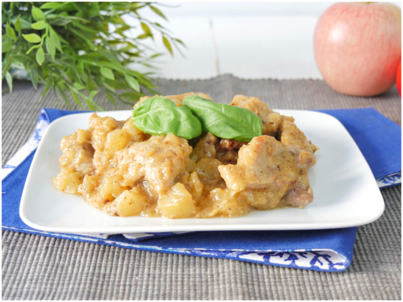 Мясо тушеное с картофелем и яблоками - рецепт действительно вкусный, по-моему, такое мясо можно подавать как основное блюдо. Яблоки в этом рецепте делают блюдо изысканным. Для 2-4 человек нам понадобится: 500 гр свинины 25 гр лук 150 гр яблок 300 гр картофеля 200 мл мясного бульона лавровый лист 40 гр сливочного масла мука масло для жарки соль перец Сначала вымойте и очистите картофель и яблоки, нарежьте их кубиком. Отварите яблоки и картофель в течение 10 минут в подсоленной воде, затем слейте воду и отложите в сторону. Свинину нарежьте на кусочки и обваляйте в муке. В сковороде на масле обжарьте мелко нарезанный лук вместе с лавровым листом до золотистого цвета, затем добавьте мясо. Обжарьте мясо до золотистого цвета (в этот момент можно добавить к мясу 20 мл коньяка). Добавьте яблоки и картофель, залейте бульоном и тушите на среднем огне приблизительно 20 минут. В конце готовки приправьте солью и перцем, добавьте сливочное масло. Также можно добавить немного молотого грецкого ореха,