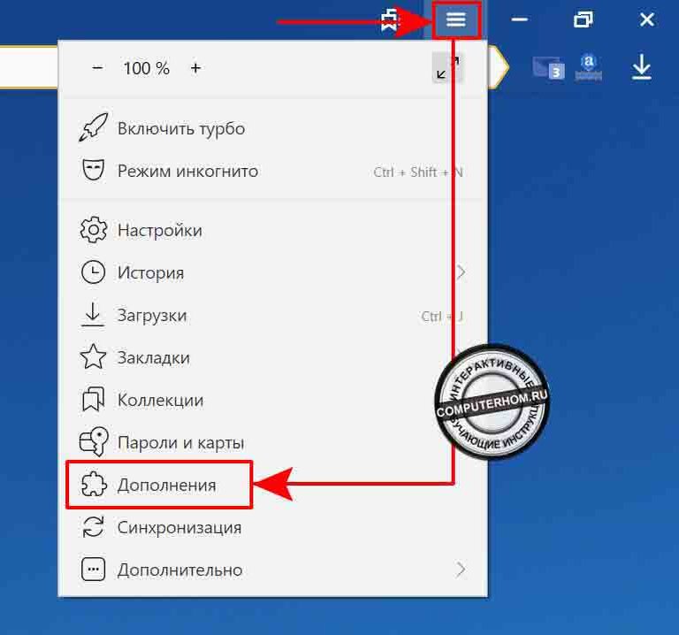 В правом верхнем углу нажимаем на кнопку «С тремя черточками». - В открывшемся меню нажимаем на кнопку «Дополнения».