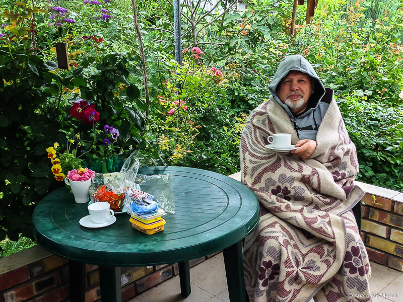 Спал на открытой веранде под двумя одеялами, под утро замерзла голова. К завтраку воздух прогрелся до +17. Но разве это нормально для середины июля в Крыму? Надел толстовку и все равно холодно, пришлось еще укутаться в плед. Обещают, что холодно будет целую неделю и только к следующей пятнице потеплеет до +25. И ладно бы такая погода у нас, ведь наш Старый Крым - это местный полюс холода, но и в Ялте будет теплее всего на 1-2 градуса. В общем, не повезло тем, кто приехал в Крым за теплым морем и солнцем. Но с другой стороны, это отличная погода, чтобы поездить по полуострову. Наверное, у экскурсионного бизнеса сейчас хорошо идут дела. А в остальном у нас все отлично. Розы радуют, пошла уже вторая волна цветения. Инжира много и он в этом году какой-то невероятно крупный. Взял рулетку, чтобы измерить, смотрите, почти 8 см. Я такого инжира еще ни разу не видел. Может быть, подать заявку на рекорд в книгу Гиннесса? Похоже, что и в этом году мы будем с персиками. Нашим персикам еще зрет