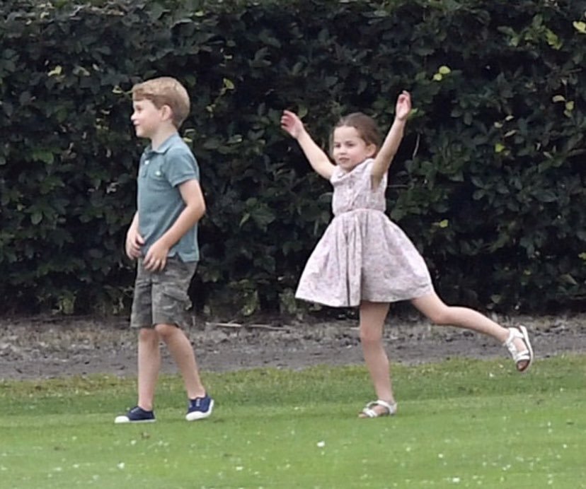 Вчера состоялся турнир по конному поло, в котором приняли участие принц Гарри и принц Уильям. Поддержать любимых приехали и Меган с Кэтрин, не забыв взять своих детей. Мы уже писали об образе Кейт на этом событии, а также делились с вами снимками герцогинь. Ссылки на эти статьи вы можете найти в конце данной статьи. Но сегодня нам хочется поделиться прекрасными фотографиями маленьких Кембриджей! Которые уже, между прочим, не такие уж и маленькие. В этом месяце принцу Джорджу исполнится уже 6 лет! Он заметно вытянулся, приобрел еще больше черт лица, похожих на принца Уильяма. Время летит быстро, малышка Шарлотта тоже уже не та малышка. Для этого мероприятия Кейт выбрала для Шарлотты платьице в мелкий цветочек и открытые сандалии, а Джордж примерил шорты хаки и майку-поло в цвет шортам. Дети Кейт Миддлтон очень много времени проводят на природе. Их мама считает, что прогулки на улице считаются самыми важными в развитии психологического и физического здоровья детей. Вчера как обычно Джо