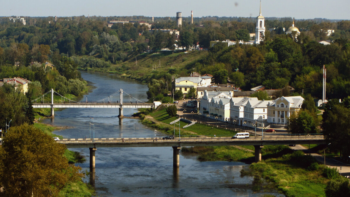 Правый берег Торжка – настоящий «старый город», место, где поселение зародилось еще во времена Древней Руси. Из левобережной части, которую мы осматривали в прошлый раз, сюда можно попасть по трем мостам, но лучший вариант – это пешеходный мостик, соединяющий улицу Красная Гора и центральную площадь Ленина/9 января. Как уже говорилось, во-первых, с моста открываются шикарные виды, а во-вторых мы с ходу попадаем в сердце старого города