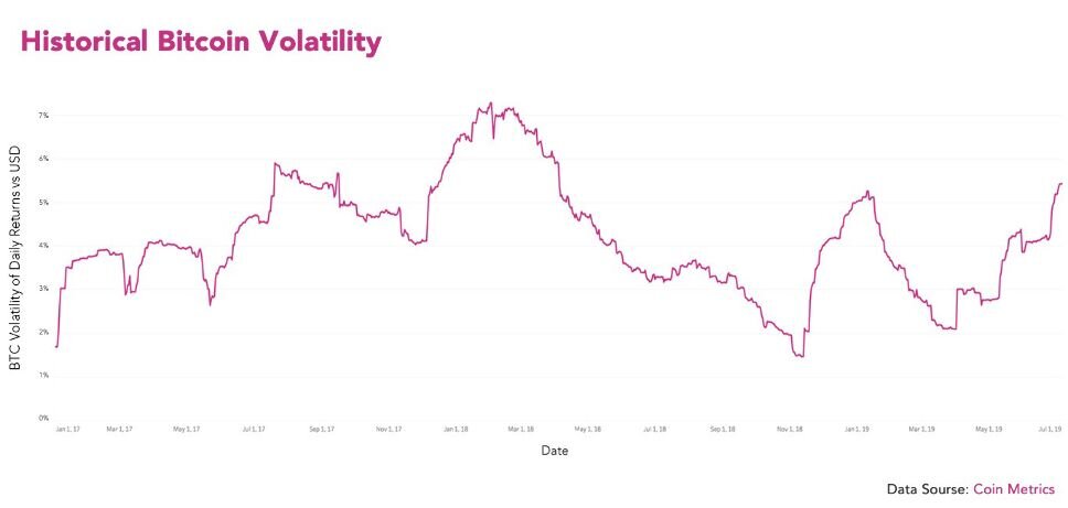 Если биткоин должен быть валютой, то он не должен быть таким волатильным, верно? Этот вопрос задают многие скептики, которые до сих пор считают цифровой актив шуткой. В то время как волатильность биткоина в основном снижалась с момента его запуска еще в январе 2009 года, криптовалюте не хватало стабильности в 2019 году. Согласно Coin Metrics, 60-дневная волатильность дневной доходности биткоина в настоящее время находится на уровнях, которых не было с начала 2018 года, когда огромный пузырь на рынке крипто-активов довольно быстро спадал. 7 июля 2019 года колебания цены биткоина в течение 60 дней на уровне 5,4% также лишь немного выше, чем это наблюдалось после резкого снижения цены биткоина в ноябре прошлого года. Конечно, волатильность криптовалюты в 2019 году направила цену в противоположном направлении. Взлет биткоина 2019 В этом году биткоин был волатильным в восходящем направлении, его цена выросла более чем на 200% по отношению к доллару США. Существует ряд различных теорий отно