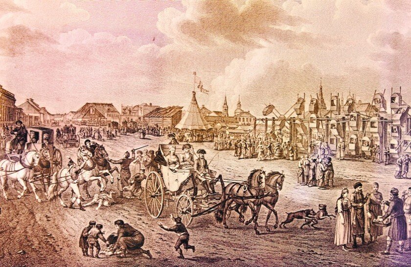 Вид Подновинского предместья в Москве, 1799 год. На гравюре изображены столкнувшиеся экипажи — видно, что пострадали даже люди. Рядом торговец предлагает свои товары, а дальше видны аттракционы и народные гулянья.