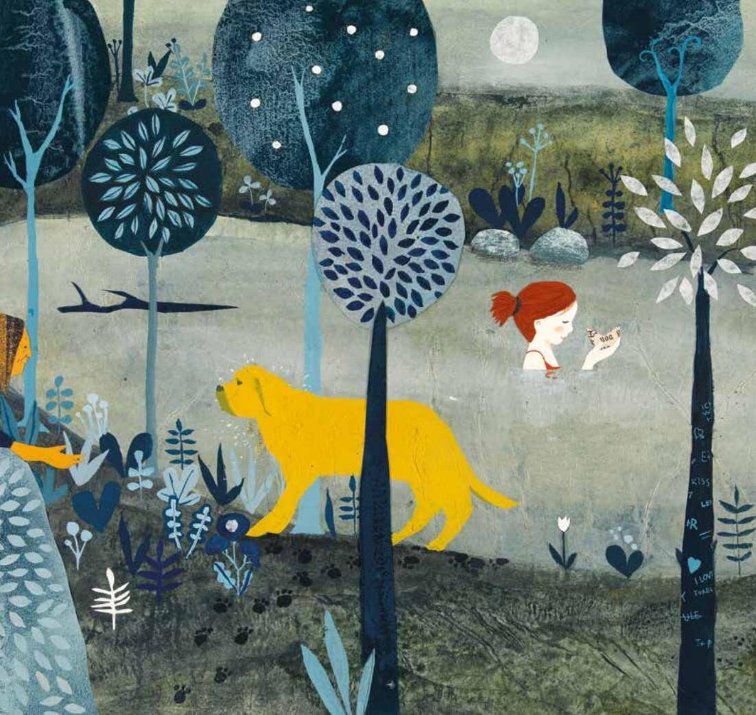 В этой книге мы следуем за потоком. Сначала он почти прозрачный, но постепенно набирает цвет и вмещает в себя все больше лиц, событий и впечатлений. Читатель плывет по реке вслед за рыжеволосой девочкой и наблюдает, как она взрослеет, влюбляется, становится мамой и постепенно стареет. Путешествие реки и девочки заканчивается неожиданно — воду сковывает сероватый лед, река так и не достигает моря, как этого мог ожидать читатель. И героиня, уже старушка, держит в руках мертвую птицу. Вероятно, это ответ художника на вопрос о том, к чему движется жизнь. По версии Михаэля Роэра, река жизни упирается в безвременье, где нет никакого движения и цветов, радостей и огорчений. Роэр совмещает в своей работе коллаж и рисунок. Девочка плывет по течению в бумажной лодочке из настоящей газеты. Реку обступают вырезанные из бумаги деревья, вырезаны и наклеены лица и фигуры персонажей, которых она встречает на своем пути. За счет коллажей и разных материалов иллюстратору удается создать множество текс