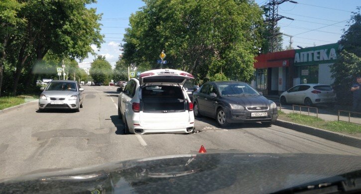 В Челябинске на улице 3-го Интернационала BMW X5 угодил в дорожную яму – под иномаркой провалился асфальт.