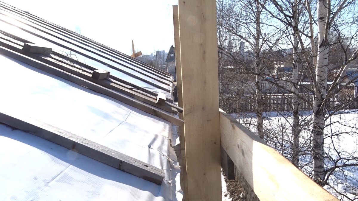 Всем привет! С вами Дмитрий, канал Gudmig//Свой дом. С изготовлением строительных лесов закончил, о том как я их изготавливал можно прочитать в предыдущей статье. Следовательно теперь можно полноценно заниматься кровлей дома. Прежде, чем заказывать железо мне нужно узнать точные размеры крыши. Для этого мне нужно будет произвести торцовку стропил. Отпиливать стропила буду так, чтобы их торец был строго вертикально относительно земли. Для начала решил убрать кровельную лестницу, заодно посмотреть ее состояние, т.к. в дальнейшем она еще может пригодится. Далее разбираю нижний ряд обрешетки крыши. Для этого подгибаю немного баннеры, они у меня служили в качестве временной гидроизоляции. Убираем нижнею доску, т.к. она будет мешаться при отпиливании стропил. Далее размечаем линии отреза стропил. Я делал это с помощью уровня. Но считаю, что более точно это можно сделать с помощью отвеса. Уровень может соврать, а вот отвес всегда покажет точную вертикаль. Но к сожалению отвес я не нашел! Отпи