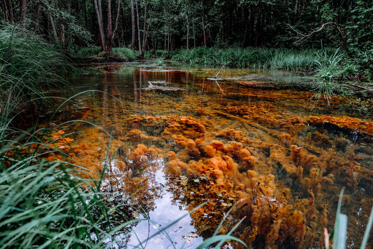 ...правда, чуть не провалились с гнилого моста во всю эту красоту... Сначала показалось, что это место с какой-то другой планеты, но потом я поняла в чем причина такого необычного цвета. В прошлые выходные мы с семьей отправились кататься по мещерским лесам - искали ягоды, дышали свежим воздухом и разведывали не банальные дорожки. Маршрут был от Покрова до Касимова практически без выезда на асфальт. Обнаружили несколько разрушенных храмов, но о них позже. Сегодня хочу вам рассказать об удивительной природной находке. Никогда бы не подумала, что совсем не далеко от Москвы есть нечто подобное. На первый взгляд выглядит удивительно, не правда ли? Со дна поднимаются водоросли, которые тоже окрашиваются в красный цвет и становятся похожи на инопланетных пришельцев. Даже сверху видно красно-коричневый цвет реки. Среди зеленого леса и полей смотрится очень сюрриалистично. Тропинка привела нас к сгнившему мостику. Скрипит. И неизвестно что от бревен осталось... Выглядит не очень внушител
