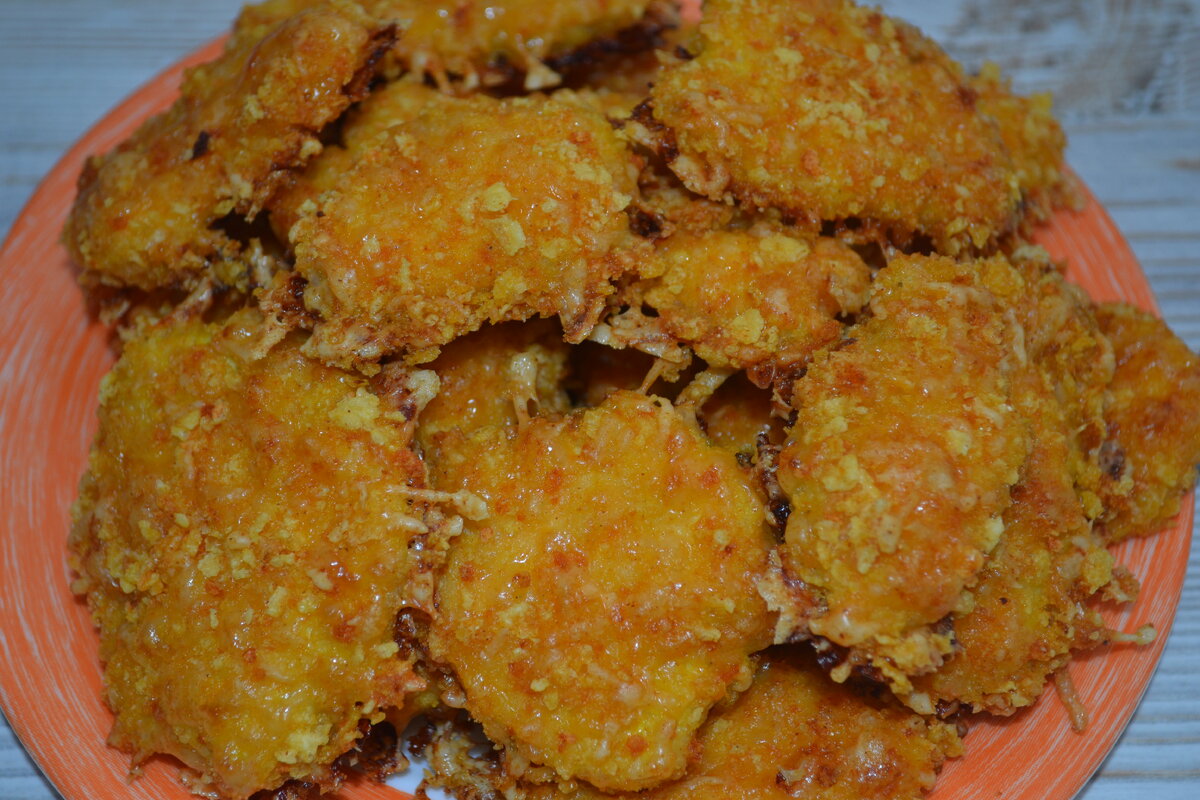 Не покупайте больше в магазине! У меня для вас очень простой рецепт наггетсов, только попробуйте и будете готовить так постоянно! Мясо получается очень нежным и сочным внутри, а снаружи хрустящая корочка, просто объедение! Ингредиенты: Маринад: Приготовление: Куриное филе промываем и нарезаем на кусочки толщиной примерно 0,5 см 3 столовые ложки сметаны перекладываем в глубокую миску, добавляем чайную ложку соли и приправы по своему вкусу, я добавляю черный молотый перец, паприку и куркуму. Перемешиваем сметану со специями, затем добавляем кусочки куриного филе, хорошенько перемешиваем и оставляем курицу мариноваться на 30 минут. Сыр натираем на мелкой терке. Кукурузные хлопья измельчаем с помощью блендера. Соединяем в миске измельченные кукурузные хлопья, натертый сыр и панировочные сухари, хорошенько перемешиваем и панируем в этой смеси кусочки куриного филе. Выкладываем наггетсы на противень и запекаем 30 минут при температуре 180 градусов. Наггетсы готовы! Очень вкусные, хрустящие