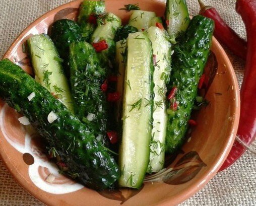 Пикантные огурчики с чесноком, от которых я просто без ума! Обожаю их, готовлю часто и долго у нас эти огурцы не залеживаются, съедаем очень быстро! Ингредиенты Огурцы Чеснок Зелень Перец красный острый Соль Сахар Зира А теперь рассказываю, как приготовить. 1 кг огурцов режем дольками. Огурчики советую брать пупырчатые и не больших размеров - они получаются вкуснее всего. Зелень мелко нарезаем. Добавляем к огурцам. Также кладём 3-4 измельченных зубчика чеснока. Готовим приправу для наших огурцов. В ступке растираем пол чайной ложки зиры, 1 чайную ложку сахара, 3/4 столовой ложки соли, а также красный жгучий перец по вкусу. Растираем до тех пор, пока не почувствуете аромат зиры. Растирать нужно обязательно - только так получается насыщенный аромат специй. Добавляем получившуюся приправу к огурцам, перемешиваем тщательно, закрываем ёмкость крышкой и убираем в холодильник на 12-18 часов (можно на ночь). Малосольные огурцы по-грузински готовы! Приятного вам аппетита! Если вам по