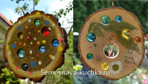 Поделки из дерева своими руками Поделки, которые светятся любовью. Вот самые простые и милые дачные поделки из дерева. Для поделки нужен спил бревна (попросите когда вам будут делать распиловку болгаркой дров сделать несколько тонких спилов). Или можно без спила – просто взять доску любого размера. В дереве мы высверливаем отверстия такой толщины, чтобы в него вошел купленный в магазине стеклянный камушек. Продаются такие наборы разноцветных декоративных стеклянных камней – в отделе подарков, и в том отделе где свечки, вазочки и все для декора праздника. Вы можете насверлить таких дырочек со стекляшками просто в доске – и подвесить ее на яблоньку. Вы можете такие дырочки просверлить в заборе – если солнце хоть раз в день светит в него под низким углом. Это очень красиво. Волшебно. Как в стране фей. Ваши дети будут в восторге от такой поделки из дерева.
