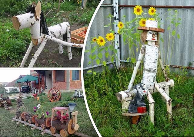 На любом приусадебном участке поселится настоящая русская сказка, если для работы использовать березовое полено. Смешные человечки, ослик с тележкой, паровозик, зайчики из спилов станут поводом для веселой улыбки и летнего радостного настроения.