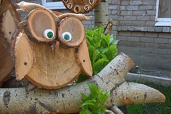 Веселые украшения для дачи Загородный дом нередко считают местом покоя и слияния с природой. Поэтому дачники стараются украсить садовый участок оригинальными вещами. Чудесным дополнением для цветочной клумбы могут стать поделки из дерева для дачи, сделанные своими руками. Они бывают разными по сложности, но некоторые доступны и для неопытных мастеров. Классический пример – деревянная сова. Для поделки понадобится один крупный спил, который станет пышным туловищем птицы. Глаза делают из кругляков поменьше, прикрепляя их к туловищу саморезами. Зрачки выделяют с помощью крышек. Чтобы получить крылья, спил среднего размера разрезают пополам. Закрепляют части с обеих сторон туловища, направляя их в разные стороны. Клюв делают отдельно – выпиливают из бревна и прикрепляют между глаз. Ушки мастерят из куска мешковины. Скручивают его в трубочку и острым углом вверх приклеивают над глазами совы. Подобным образом получают и второе ушко. Посадить ее можно на сруб небольшого древа, положив его
