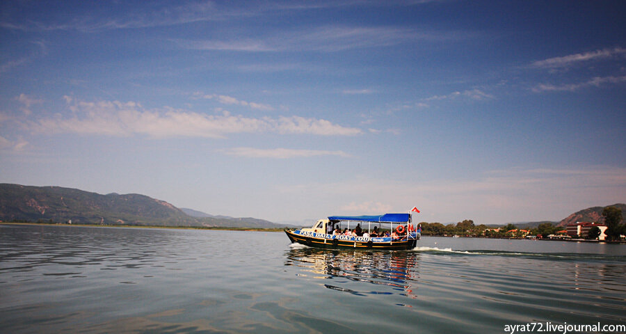 Городок Кейджегиз на северном берегу одноименного озера расположен на автодороге Мармарис-Фетхие. Отсюда начинаются экскурсионные плавания по озеру с посещением грязевых и минеральных бассейнов в Султание с дальнейшим следованием по реке Дальян мимо древних ликийских гробниц к морскому пляжу Истузу. Также можно добраться в городок на прокатном автомобиле и нанять судно на пристани и прокатиться по индивидуальной программе. Отплываем от пристани. Любуемся панорамой городка в окружении гор. Остров Тюремный с развалинами старинной тюрьмы. У острова есть второе название - остров Любви. Вариант приятней. Есть и легенда, в точности я ее не запомнил, но что-то связанное с любовью молодых вопреки выбору родителей. Распространенная на Востоке тема. Небо сегодня великолепно. На таких яхтах катают туристов. Берега и острова с зарослями сосен и амбровых деревьев. Цвет воды несколько разный на фотографиях в зависимости от расположения солнца. Вода приятного зеленоватого цвета, достаточно прозрачна