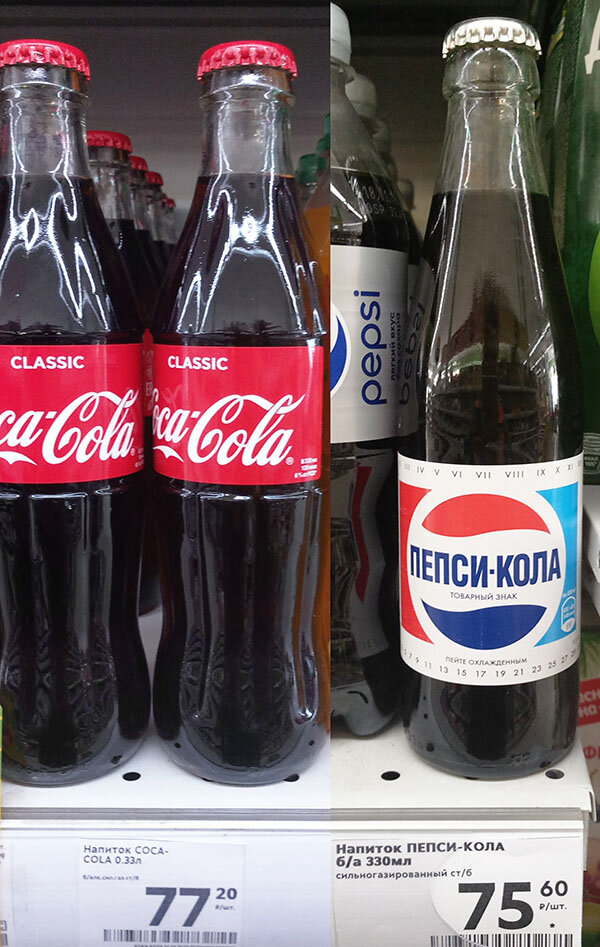 Цены в "Пятерочке" на Пепси-Колу и Кока-Колу в стеклянных бутылках 0,33 литра сопоставимы. А стекло в более, чем 1,5 раза дороже баночки Такой ценник только за стекло или.... ? Состав: ... сахарный колер (добавка Е150 или карамель), регулятор кислотности ортофосфорная кислота (пищевая добавка Е338), кофеин (взбадривание, возбуждающие свойства, физическое привыкание)... Состав на этикетках Pepsi-Cola аналогичен с Кока-Колой - только прописан в Ешках. К лимонадам в "пластике" подешевле ещё вернёмся - может быть и вкусовые свойства напитков будут отличаться ... Предлагаю в комментариях оценить эти напитки по 10-ти бальной шкале.